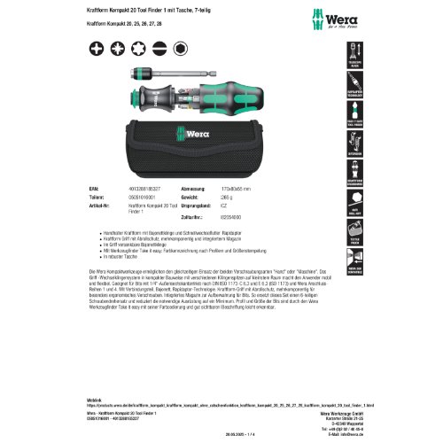 Eigenschaften "Wera Kraftform Kompakt 20 Tool Finder 1 mit Tasche, 7-teilig"