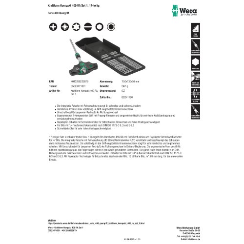 Eigenschaften "Wera Kraftform Kompakt 400 RA Set 1, 17-teilig"