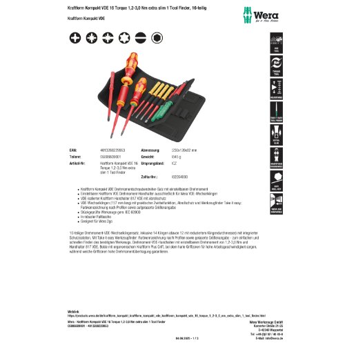 05006530001 Angaben gemäß Produktsicherheitsverordnung ((EU) 2023/998): Hersteller: Wera Werkzeuge GmbH, Korzerter Straße 21-25, D- 42349 Wuppertal Tel.: +49 (0)202/4045 - 0