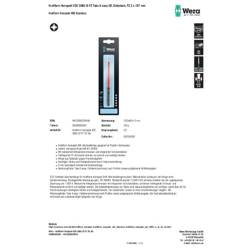 Kraftform Kompakt VDE 3065 iS PZ Take it easy SB, Edelstahl, PZ 2 x 157 mm VDE Edelstahl-Wechselklinge für Kraftform Kompakt Griff-/Wechselklingensystem. Blitzschneller Austausch der Klinge ohne Sonderwerkzeug. Stückgeprüfte Werkzeuge gem. IEC 60900. Stückprüfung bei 10.000 V für sicheres Arbeiten bei der zugelassenen Spannung von 1.000 V. Reduzierter Klingendurchmesser mit integrierter Schutzisolation, so können tiefliegende Schraub- und Federelemente erreicht und betätigt werden. Die Edelstahlwerkzeuge von Wera sind vakuumeisgehärtet und verfügen damit über die für Verschraubungen benötigten Härten und Festigkeitswerte. Der industrielle Einsatz ist ohne Einschränkungen möglich. Mit Werkzeugfinder Take it easy: Farbkennzeichnung nach Profilen sowie aufgelaserter Größenangabe. Der Sechskantabrollschutz verhindert das unbeabsichtigte Wegrollen der Klinge. 05006583001