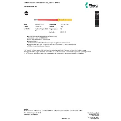Variante: | Wera Kraftform Kompakt VDE 60 i Take it easy, 0,8 x 4 x 157 mm |