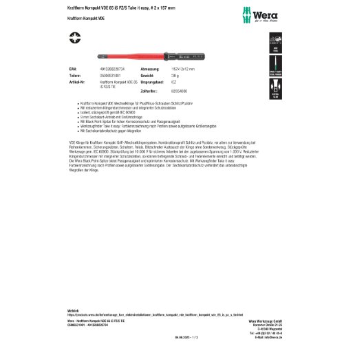 VDE Klinge für Kraftform Kompakt Griff-/Wechselklingensystem. Kombinationsprofil Schlitz und Pozidriv, vor allem zur Verwendung bei Reihenklemmen, Sicherungskästen, Schaltern, Relais. Blitzschneller Austausch der Klinge ohne Sonderwerkzeug. Stückgeprüfte Werkzeuge gem. IEC 60900. Stückprüfung bei 10.000 V für sicheres Arbeiten bei der zugelassenen Spannung von 1.000 V. Reduzierter Klingendurchmesser mit integrierter Schutzisolation, so können tiefliegende Schraub- und Federelemente erreicht und betätigt werden. Die Wera Black Point-Spitze bietet Passgenauigkeit und optimierten Korrosionsschutz. Mit Werkzeugfinder Take it easy: Farbkennzeichnung nach Profilen sowie aufgelaserter Größenangabe. Der Sechskantabrollschutz verhindert das unbeabsichtigte Wegrollen der Klinge.