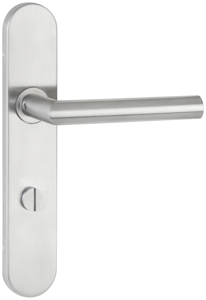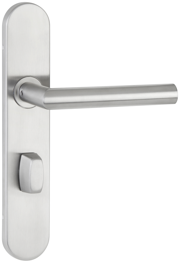 Bad-Drückergarnitur 1802 BASIC 02 - Klasse 4 mit Langschild 2002 U - Befestigung unsichtbar Ausf.: BAD 78 mm, Riegel 3221/3216, Tst. 37-50 mit Rückholfeder, links/rechts verwendbar Oberfl. 60 (Edelstahl matt)