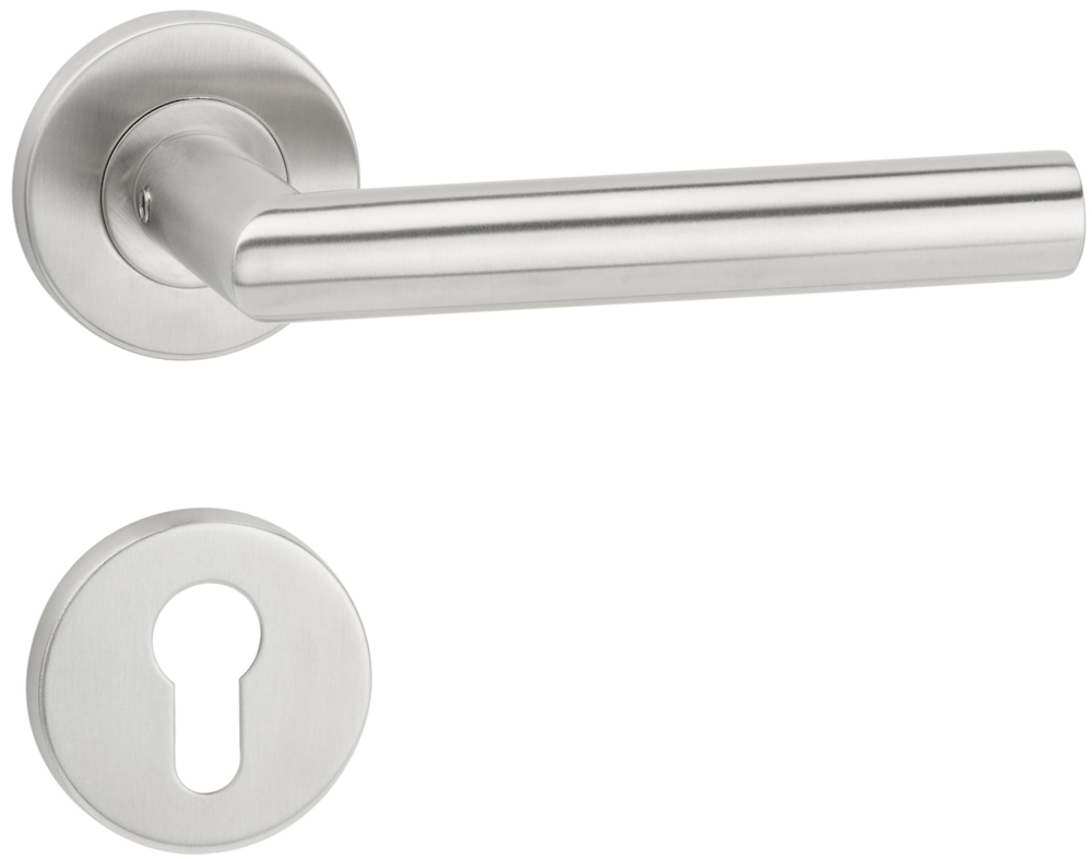 ZT-Drückergarnitur 1802 BASIC 02 - Klasse 3 mit Rosetten 2073 M Ausf.: PZ fest/drehb. m. Rückholf., Metall-UK, Tst. 37-48 mm Oberfl. 60 (Edelstahl matt)