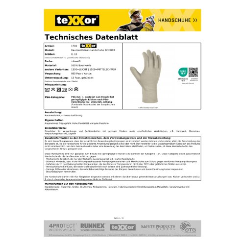 Eigenschaften "teXXor® Baumwolltrikot-Handschuhe SCHWER 10, rohweiß"