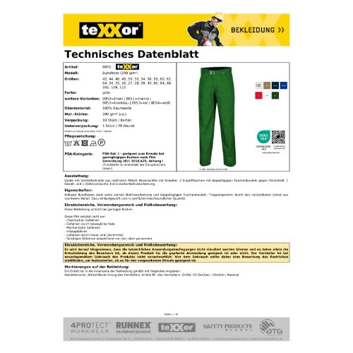 Eigenschaften "teXXor® Bundhose 290 g/m² 52, grün"