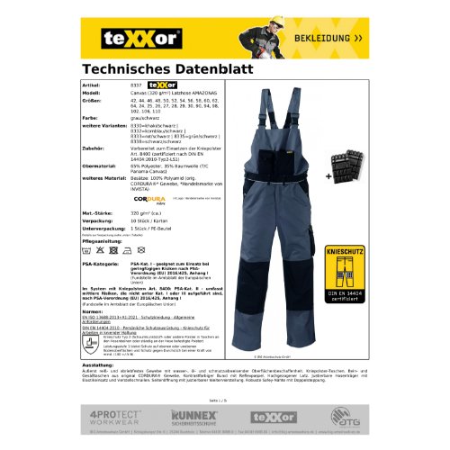 Eigenschaften "teXXor® Canvas (320 g/m²) Latzhose AMAZONAS 106, grau/schwarz"