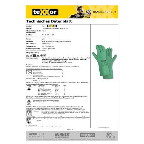 Eigenschaften "teXXor® Chemikalienschutz-Handschuhe NITRIL 10, grün"
