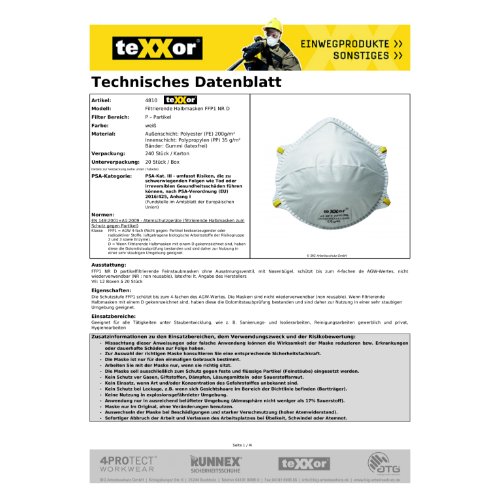 | Variante: | teXXor® Feinstaubmaske FFP1 NR D mit Nasenbügel, weiß |