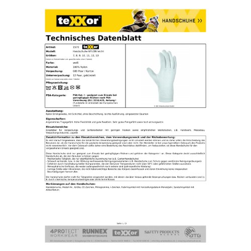 Eigenschaften "teXXor® Handschuhe NYLON leicht 11, weiß"