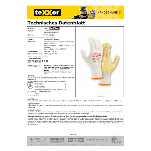 Eigenschaften "teXXor® Mittelstrick-Handschuhe BAUMWOLLE/NYLON 7, beige/gelbe Noppen"