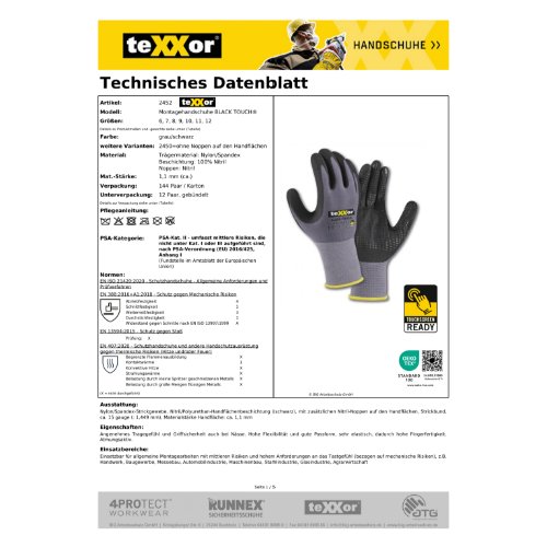Eigenschaften "teXXor® Nylon-Strickhandschuhe BLACK TOUCH® 10, grau/schwarz"