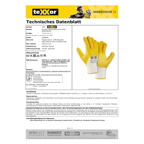 Eigenschaften "teXXor® Polyester-Strickhandschuhe NITRIL BESCHICHTET 9, weiß/gelb"