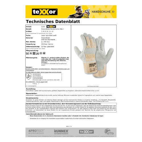 Eigenschaften "teXXor® Rindvollleder-Handschuhe URAL I 11, Leder natur/Drell weiß"