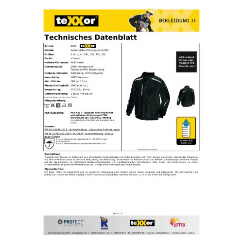 Eigenschaften "teXXor® Wasserdichte Piloten-Jacke FJORD 5XL, schwarz"