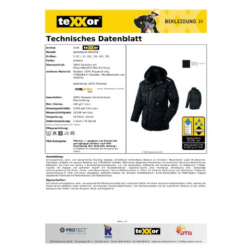 Eigenschaften "teXXor® Winter-Jacke BOSTON 3XL, schwarz"