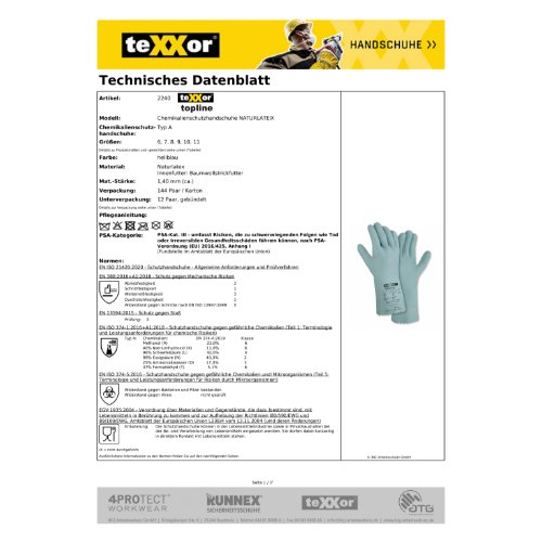 Eigenschaften "teXXor® topline Chemikalienschutz-Handschuhe NATURLATEX 7, hellblau"
