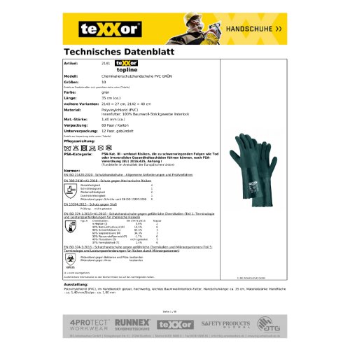 Eigenschaften "teXXor® topline Chemikalienschutz-Handschuhe PVC GRÜN 10"